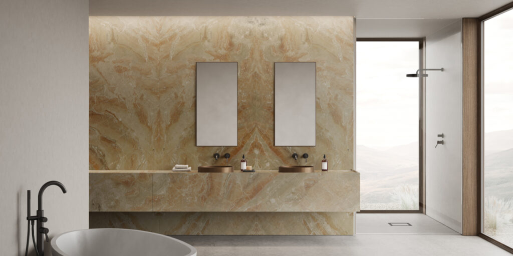 Breccia Oniciata is a beige marble with large veins ranging from yellow to hazelnut in colour. Marble suitable for interiors. Available finishes: polished, honed, brushed.