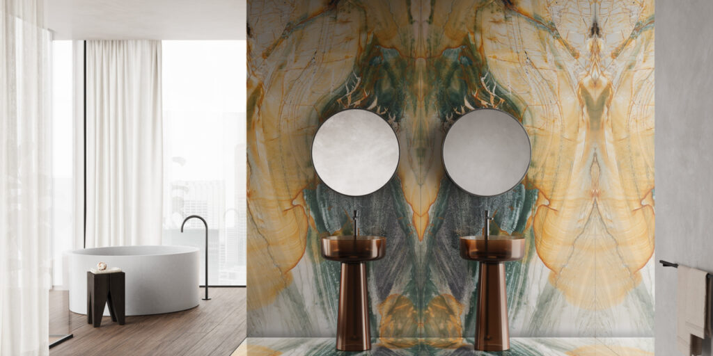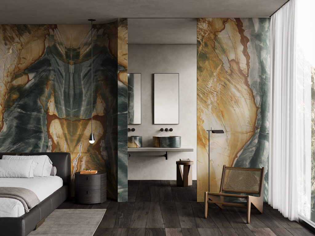 Veins that vary from yellow to green and flutter harmoniously along the entire surface of the slab: this Brazilian quartzite is a real sight for sore eyes. Polaris Gold is an exclusive quartzite that is perfect for embellishing any environment, also thanks to its durability, which makes it suitable for both outdoor and indoor use. Applicable finishes: polished, honed, brushed.