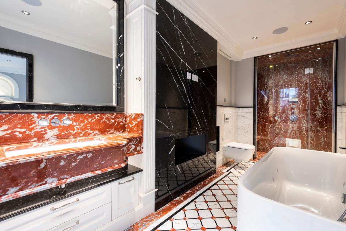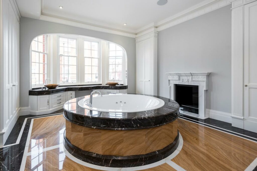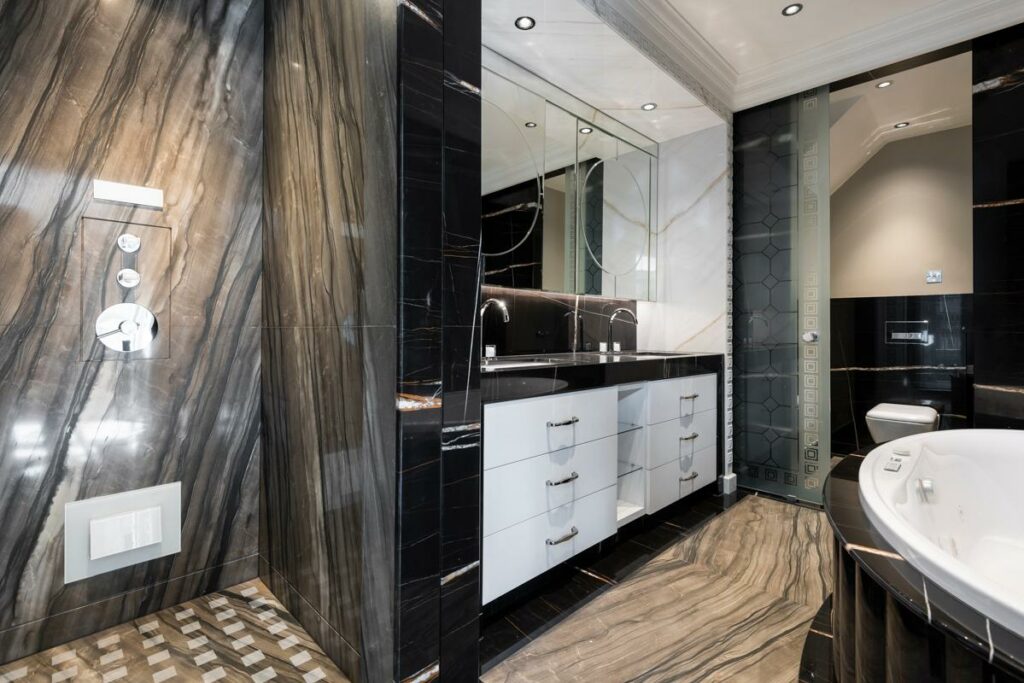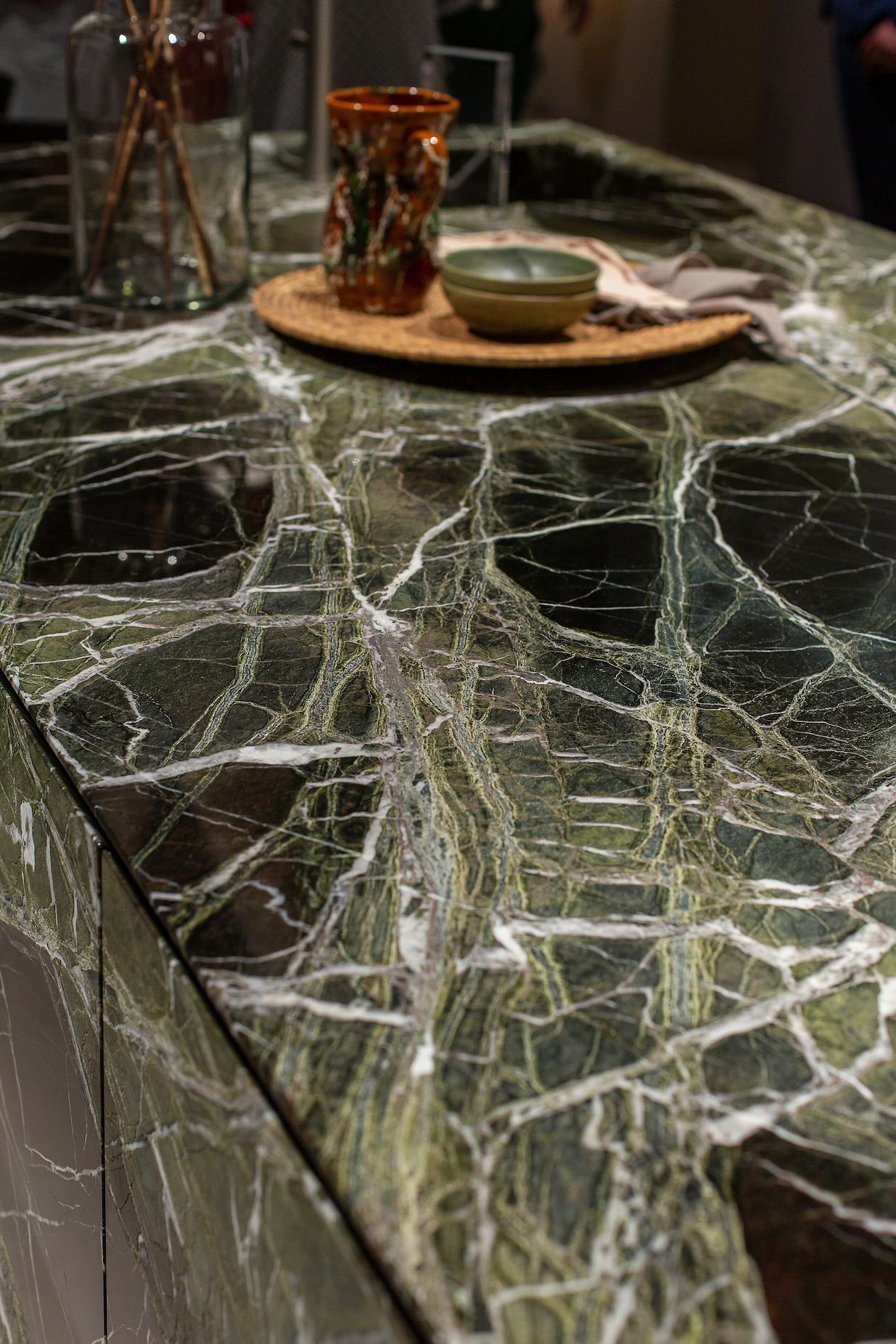 Bold, decorative marbles — with dramatic veining once considered too delicate — become viable options. Light-coloured stones return to the palette even in intensive-use contexts.
