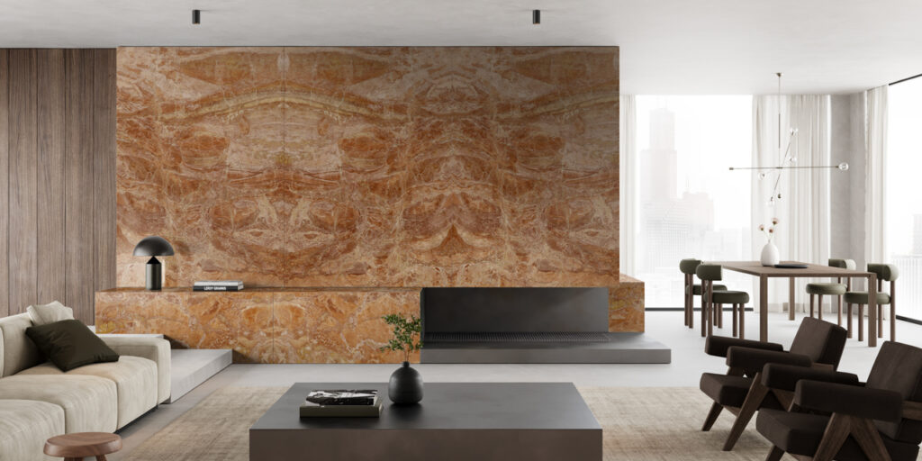 Breccia Bohemien, un marmo con toni caldi rosso aranciato e venature bianche, scalda qualsiasi ambiente. Adatto a interni ed esterni, proviene da una cava in Toscana. Finiture applicabili: lucido, levigato, spazzolato, sabbiato.
