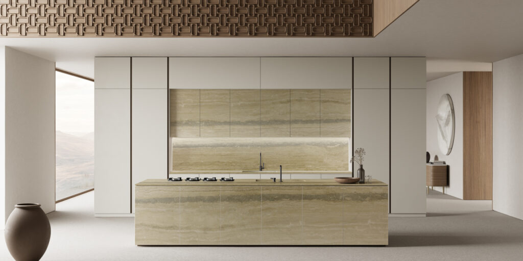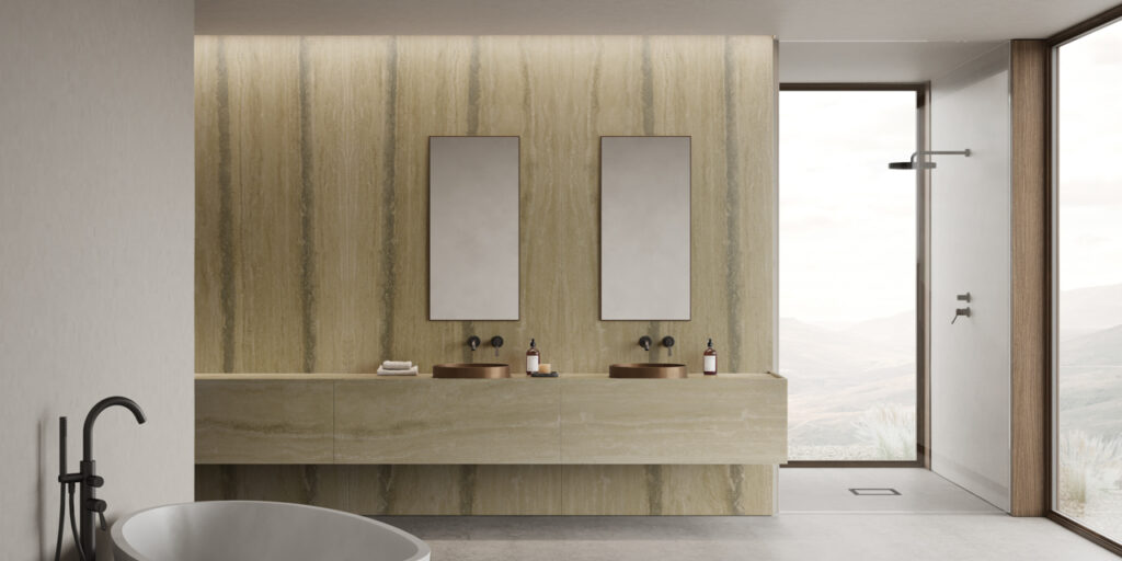Un Travertino Romano compatto e duttile, dai colori chiari e caldi, con striature che lo attraversano nel senso della lunghezza: un materiale eclettico, tagliato in controfalda per esaltarne le caratteristiche. Estratto nelle cave di Tivoli e Guidonia – vicino a Roma è ideale per interni ed esterni. Finiture applicabili: lucido, levigato, spazzolato, bocciardato, sabbiato.